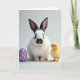 This greeting card shows a white-furred bunny with dark ears and a dark nose, facing forward with a gentle gaze that feels like a quiet invitation 🐰. Fine whiskers spread from its cheeks, and the soft lighting makes the fur look touchable without harsh shadows. Beside it stands a tiny yellow chick, upright and attentive, its small dark eyes turned toward the bunny as if sharing a private moment of friendship 🐇. On the left, a smooth purple egg dotted with small white circles adds a cheerful accent and a tidy sense of balance. Near the top, a short Easter greeting is placed in a simple, easy-to-read style, set in a light color that contrasts softly against the background. The background stays minimal and softly blurred, keeping the bunny and chick close together in the frame 🌷. The purple egg sits slightly forward on the left, its white dots evenly spaced across the glossy surface.