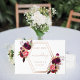 A white background, rose gold foil text. Decorated with a geometric frame and florals in burgundy and pink. Personalize and add your names and the wedding date.