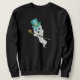 This sweatshirt has a white ghost with a silly face that has big blue eyes and open mouth holding a black and gold cane topped with a skull and wearing a blue top hat.