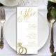 Elegant white and gold wedding reception menu with shiny diamond ring. Personalize it with your event details.