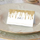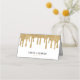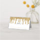 White and gold glitter drip wedding reception folded place cards. Personalize it with your event details.