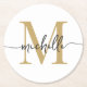 Girly Modern Simple Elegant White and Gold Monogram Initial Name Signature Script Custom Personalized Round Paper Coaster. This design featuring your first name in a pretty hand lettered style swash tail font typography (or calligraphy) with monogram initial in gold and black on white color background. These are easy to customize it. Great stylish feminine housewarming gift, also for birthday, wedding, bridal shower, mother’s day, sweet 16 birthday party, baby shower, for graduation party and It’s for the girl who loves minimal unique stylish things.