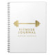 A chic and modern fitness journal to track your fitness journey and success, featuring a faux gold fitness weight icon, "fitness journal" and your name, also in gold. The background is in white.