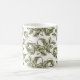 An elegant coffee mug with a pattern of etched roses in white and golds on white.