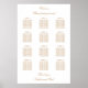An elegant seating chart poster featuring stylish text in a golden shade of beige on traditional classic white. Please personalize the names of the couple and the names of the guests along with any of the other text that you may wish to personalize.
