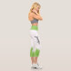 These white and green stylish workout leggings feature an elegant white floral design on a bright green background on the waistband and on the legs with white stripes.