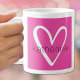 This stylish coffee mug features a first name over a cute white heart on a hot pink background. MORE colors and matching items in our collection.