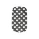 This press-on nail features two-tone white hearts arranged in an up-and-down pattern on a black background.
