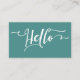 This simple, friendly card features the word "Hello" on the front. It has been rendered here in a beautiful, modern script font, with swirling embellishments, in bold white. The background of the front was set to editable teal, which you can change to any color you prefer | Your personal details appear on the back. I've set up template fields for your name, phone number, email address, and there's one additional line for whatever else you'd like to include. Of course you can make further changes, too! Whereas just filling in the template fields will render your details in black, in a versatile serif font, left and bottom-aligned, should you wish to make even more updates, simply click the link for further customization and you can change the font, size, its color, the background color, and the positions of the words. You can also use this option for placing additional text fields on the card, should you need to include more personal information. Please let me know if you need help with anything!