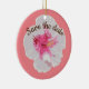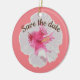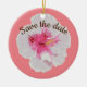 Beautiful save the date custom text and background color ornament with white Hibiscus flowers .