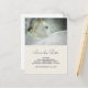 Save the date postcard with a serene photograph featuring a beautiful white horse with a little bird resting on his neck. A magical winter snowfall gives the image a wonderful mystical quality.