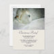 Christmas party invitation postcard with a serene photograph featuring a beautiful white horse with a little bird resting on his neck. A magical winter snowfall gives the image a wonderful mystical quality.