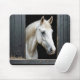 A white horse peers out of a stable window set against the contrast of dark wooden planks