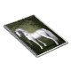 A magical white horse stands in an enchanted woodland, surrounded by brightly colored hummingbirds in this digital fantasy artwork by artist Jayne Wilson.