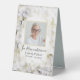 Remember the life of your loved one after their death with the elegant White Hydrangea Watercolor Celebration of Life Funeral Table Tent Sign. This double sided pretty custom flowery tribute memorial signage features a digitally watercolor painted floral photograph of white hydrangea flower blossom petals. Feel free to change the text to suit your needs and personalize it with a photograph, name, dates and life story of your departed.