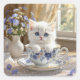 A fluffy white kitten with striking blue eyes is nestled inside a blue-and-white floral teacup on a lace tablecloth with forget-me-not flowers as sunlight filters through a window