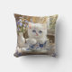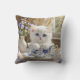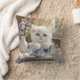 A fluffy white kitten with striking blue eyes is nestled inside a blue-and-white floral teacup on a lace tablecloth with forget-me-not flowers as sunlight filters through a window