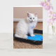 Cute white kitten with blue paint splatters on its fur sitting in a paint tray.