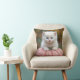 A fluffy white kitten with striking blue eyes sits adorably on top of a pink pumpkin