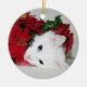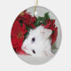 Blue eyed, long haired white kitty cat plays with the Christmas decoration photo round Christmas ornament