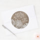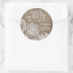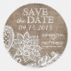 White lace over grunge rustic burlap background elegant modern goth save the date sticker label.