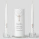 Personalized First Holy Communion Candles featuring a white lace pattern and gold crucifix.