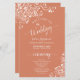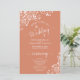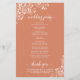 These wedding programs are elegant and tasteful, while still being budget friendly. The design features an ornate white floral lace pattern on a terracotta or coral orange colored background. The typography features lacy script calligraphy, and there is room for details on the ceremony, the bridal party, and a short thank you.