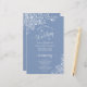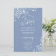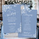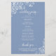 These wedding programs are elegant and tasteful, while still being budget friendly. The design features an ornate white floral lace pattern on a dusty blue or periwinkle colored background. The typography features lacy script calligraphy, and there is room for details on the ceremony, the bridal party, and a short thank you.