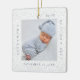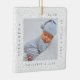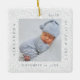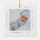 Minimal and elegant simple baby photo & birth Stats keepsake photo ornament. The design features an elegant faux white lace background. simple minimal design with a postage stage photo frame design to display your special baby photo. The Baby's Name, date, time, and birth stats are displayed in a simple modern design around the photo. Front and back is the same design.