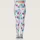 White leggings with vibrant floral patterns, featuring purple, blue, and green flowers and leaves. Worn with black sneakers, conveying a lively, colorful tone.