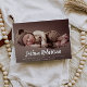 trendy white script design with a lovely newly born baby photo, the features of this card can be personalized.