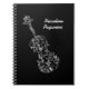 A white line drawing of a violin, composed entirely of calligraphic swirls and flourishes, is displayed at a slight angle on the front of this spiral notebook, against a solid black background. The name shown is easily edited to reflect your desired text, or delete altogether if preferred. This is a recurring motif, to be found in many variations and on an extended range of products available from MissPrinteditions, geared to those who love the violin.