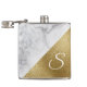 Stylish drinking flask done in a modern look of white marble on half the flask and gold foil look, on the other half. A white one letter monogram is ready to personalize. Lovely gift idea for her.