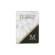 Elegant and unique passport cover to personalize with your monogram initial letter. The designer passport cover has a white marble background print with a gold glitter line and black color block .