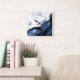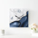 Elegant modern white marble and navy blue agate trimmed with faux gold glitter combine in this luxurious square wall clock. The numbers 3 and 6 appear in light gray on the blue agate background, while the numbers 9 and 12 appear in blue on the white marble.