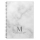 Professional notebook features custom monogram, name and text in grey classic serif font style on white marble background.