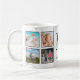 Create your own personalized 8 photo collage coffee mug with your custom images, monogram and name on a stylish elegant white marble background.