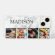Create your own personalized 4 photo collage phone case with your custom images and name on a stylish elegant white marble background.
