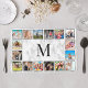 Create your own personalized 16 photo collage placemat with your custom images and monogram on a stylish elegant white marble background.