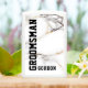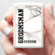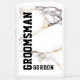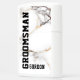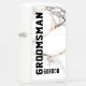 White marble texture image with gold and gray accents and customizable text in black for the groomsman and groomsman name.