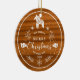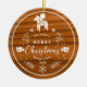 White Christmas circle ornament with Christmas pony, peace birds, snowflakes, and botanical branches on a mahogany wood texture.