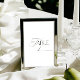 A modern classic wedding table number card designed with elegant serif typography and refined minimal style. Perfect for timeless, black-and-white wedding décor and formal receptions.