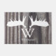 Weathered old grey wood print background with white moose antlers silhouette and your personalized family name and monogram in white.