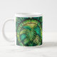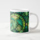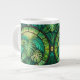 White mug featuring a vibrant, intricate pattern of green tropical leaves with black curves and geometric shapes, evoking a lush, natural feel.