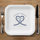 Nautical blue and white wedding paper plates. Great for a Navy (military) or lake house wedding. Design features a heart shaped rope with anchor and couple initials in the middle. Personalize it with your wedding details.