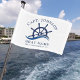 Nautical blue and white boat flag with a ship helm and ocean waves. Great boat accessory for a yacht owner or any sailor. Personalize it by adding your name, your boat name and the city you set sail in.