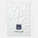 White and navy blue anchor personalized kitchen towels. Navy blue and white square anchor with your name beneath on a white background.