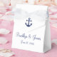 White and navy blue nautical wedding favor boxes (tent favor box with white ribbon) with anchor and customizable text - you can add bride's and groom's name and wedding date.