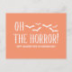 Trendy and modern Oh The Horror Halloween Postcard with a cool typography design and a bunch of spooky bats in white. This simple and fun text design postcard can be easily customized with a fun Halloween greeting and the background color of your choosing. Find more customization options by clicking Customize It.