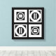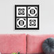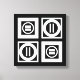 Bold geometric pattern features four white squares with space between them on a black background. The diagonally opposed thick squares each contain a thin white circle with a thick equal sign inside. In contrast, the thin squares each contain a thick white circle that touches the square’s edges with a thin vertical equal sign inside.